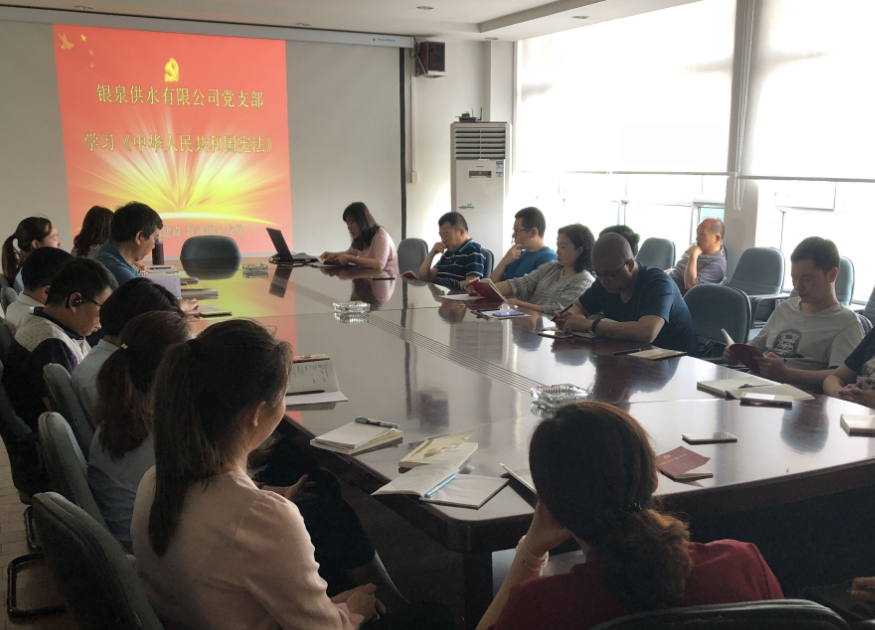 為認真學習貫徹黨的十九大精神,深入學習領會習近平新時代中國特色社會主義思想,牢固樹立“四個意識”緊盯落實總目標,進一步加大《憲法》宣傳力度,切實提升公司黨員干部職工在反腐敗建設的知情權、參與權和監督權。6月1日下午,銀泉供水有限公司黨支部在五樓會議室開展“黨章在心中•紀法伴我行”學習《中華人民共和國憲法》活動。