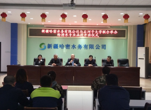 2019年11月8日,新疆哈密水務(wù)有限公司與石河子大學聯(lián)合舉辦給排水函授專業(yè),2019級全體新生在公司六樓會議室舉行了隆重的開班儀式。新疆哈密水務(wù)有限公司班子成員、哈密職業(yè)技術(shù)學院院長助理鄭金林、哈密職業(yè)技術(shù)學院繼續(xù)教育中心副主任胡慧霞出席了開班儀式,哈密水務(wù)黨總支副書記王芳主持。