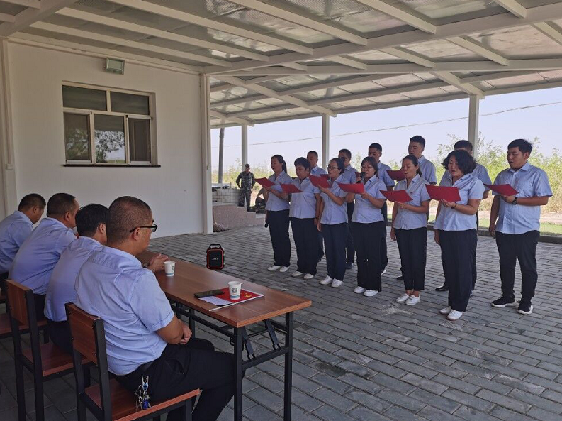 伴隨著激昂的國歌旋律,鮮艷的五星紅旗也隨風飄揚,升旗儀式在莊嚴肅穆的氛圍中有序進行,隨后公司黨支部書記帶領全體黨員面向黨旗,高舉右臂,莊嚴宣誓,一句句鏗鏘有力的入黨誓詞是大家不忘的初心,回音在耳邊縈繞,在心中激蕩。
